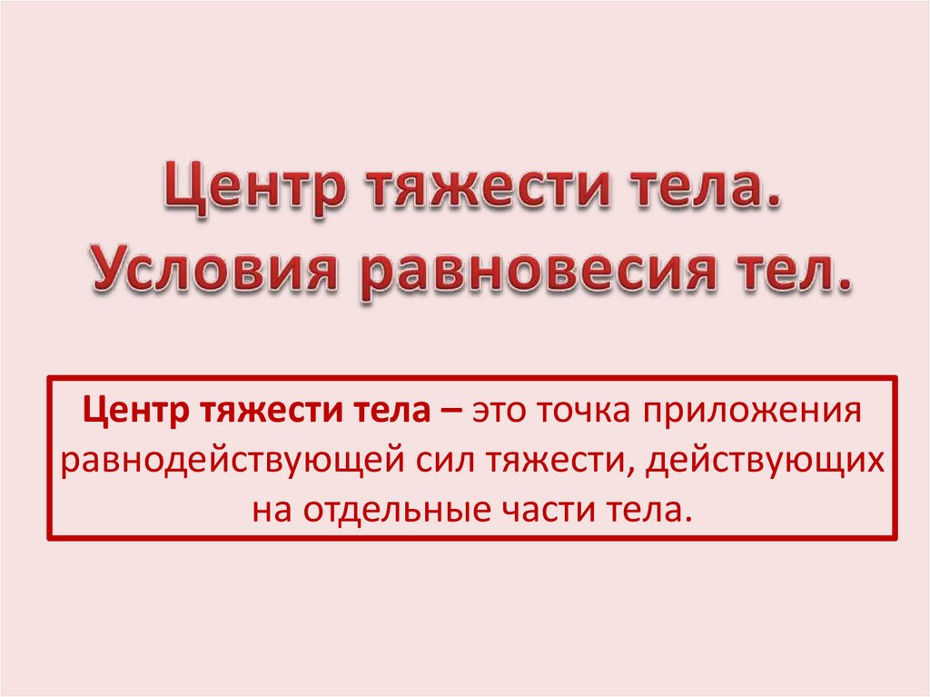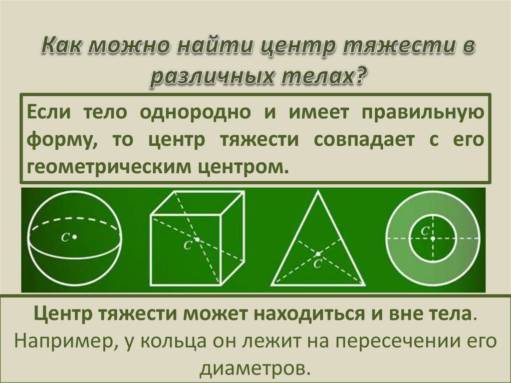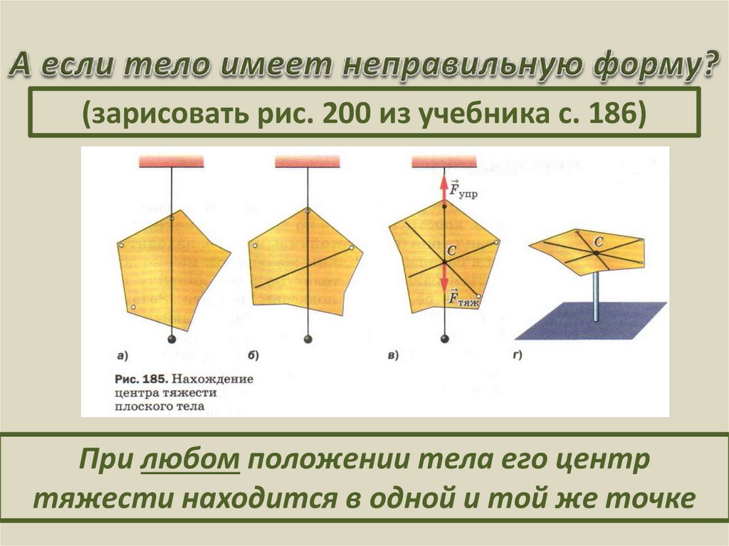 (зарисовать рис. 200 из учебника с. 186)При любом положении тела его центр