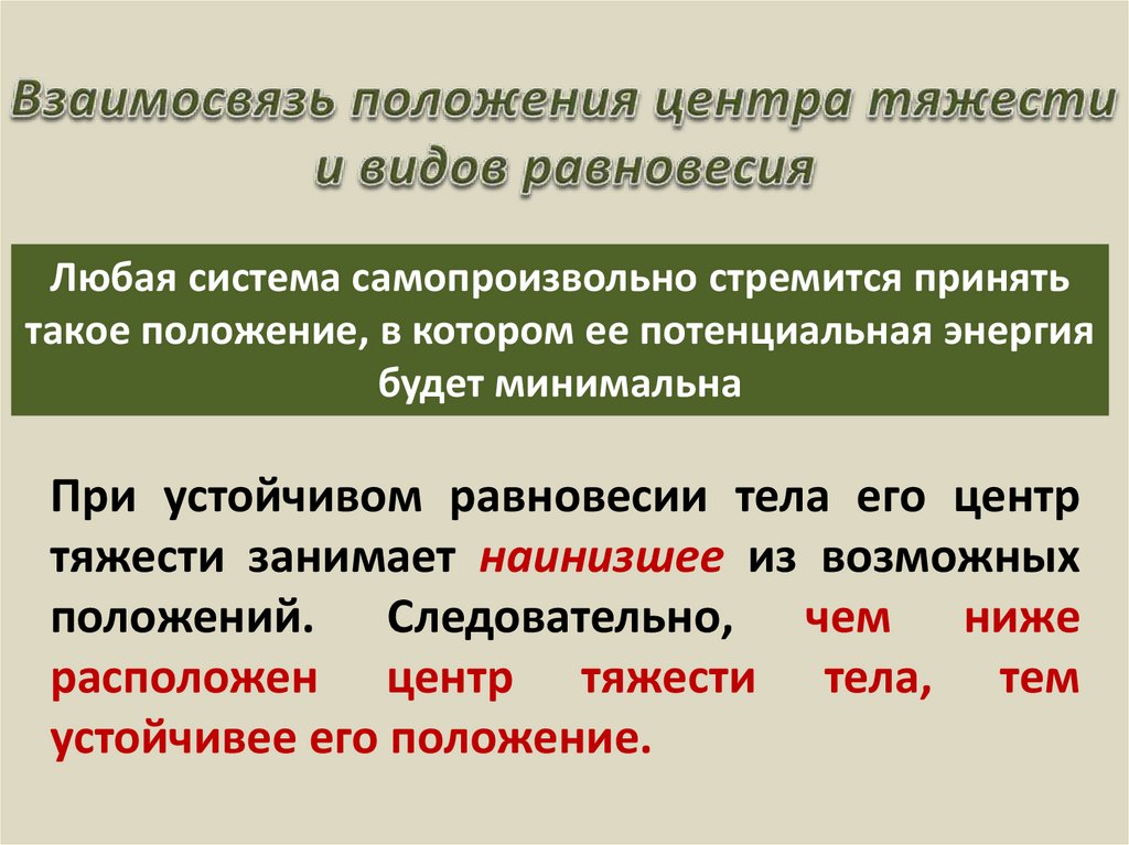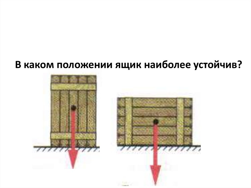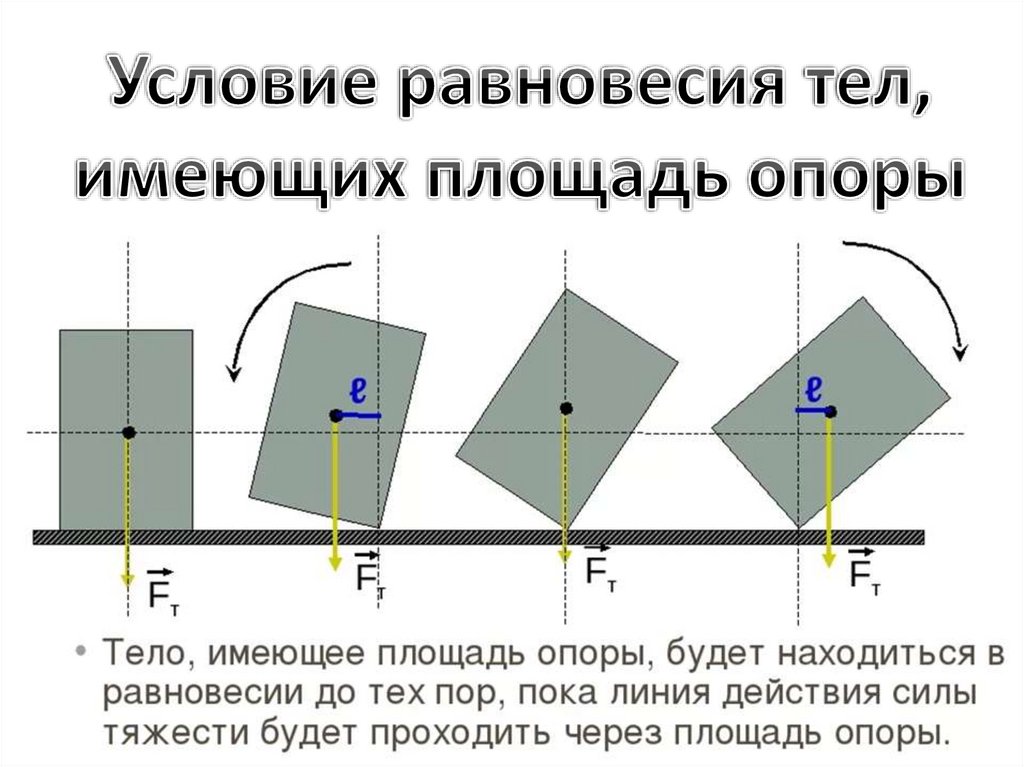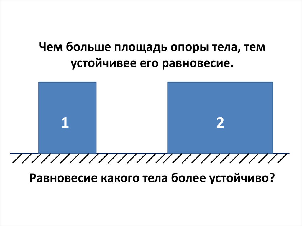 Чем больше площадь опоры тела, темустойчивее его равновесие.