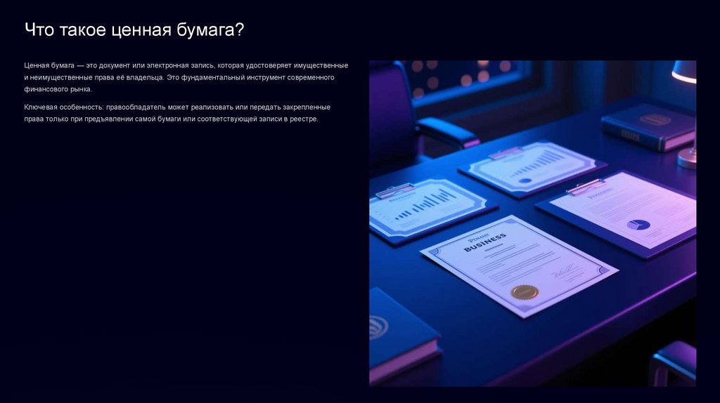 Что такое ценная бумага?Ценная бумага — это документ или электронная запись, которая удостоверяет имущественные