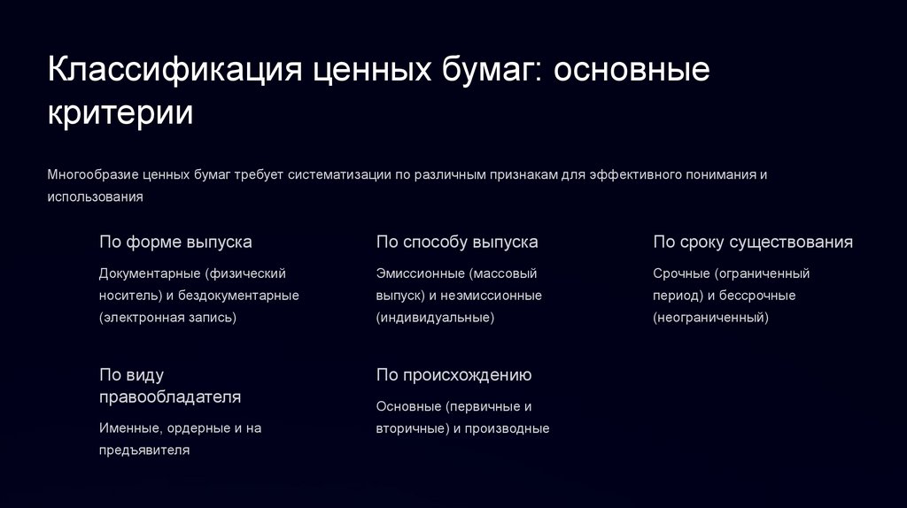 Многообразие ценных бумаг требует систематизации по различным признакам для эффективного понимания и