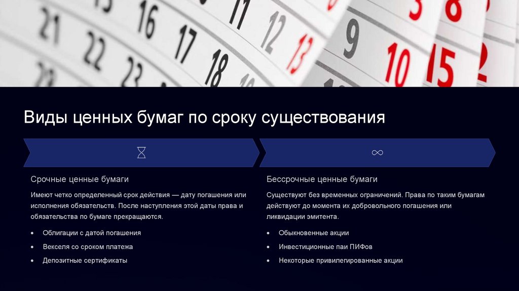 Виды ценных бумаг по сроку существованияСрочные ценные бумаги