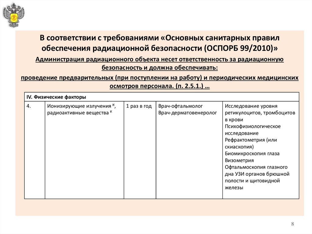 В соответствии с требованиями «Основных санитарных правилобеспечения радиационной безопасности (ОСПОРБ 99/2010)»