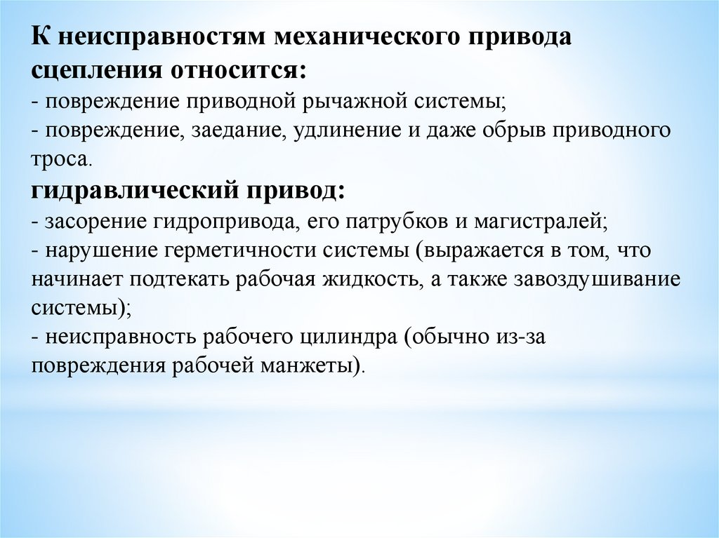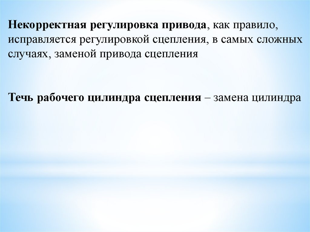 Некорректная регулировка привода, как правило,исправляется регулировкой сцепления, в самых сложных