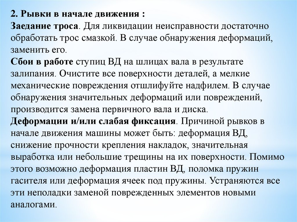 2. Рывки в начале движения :Заедание троса. Для ликвидации неисправности достаточно