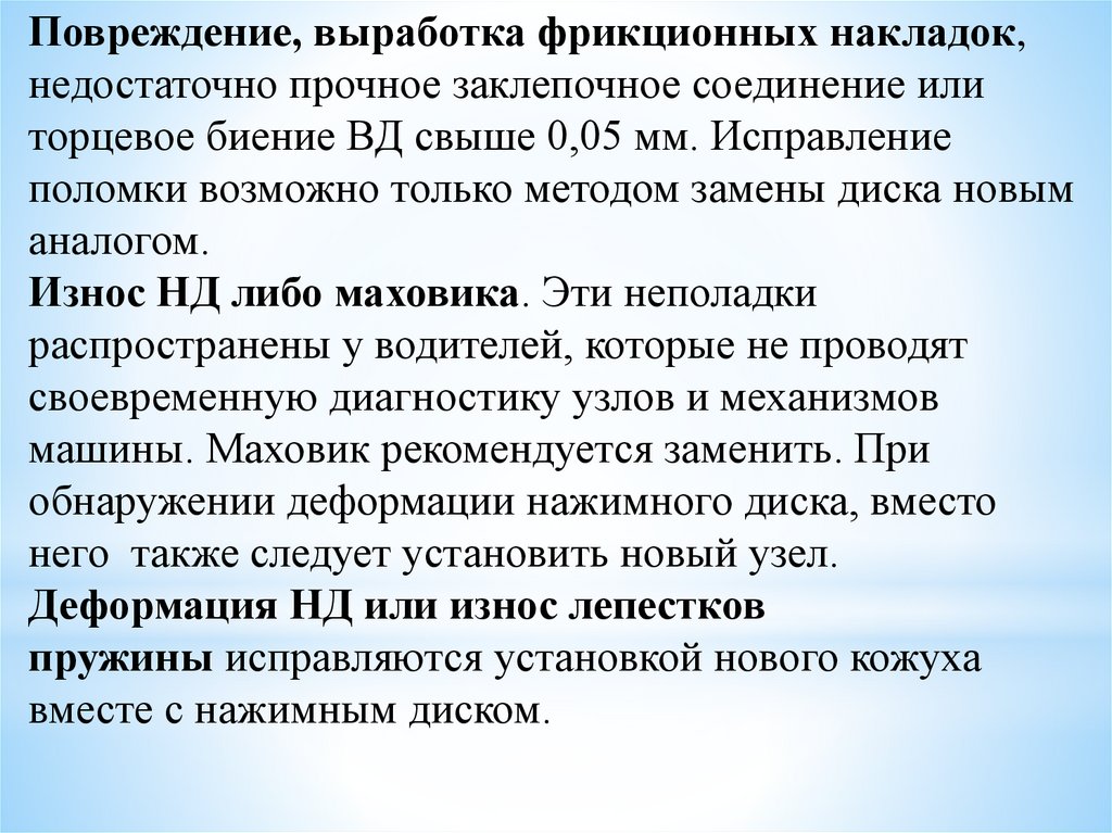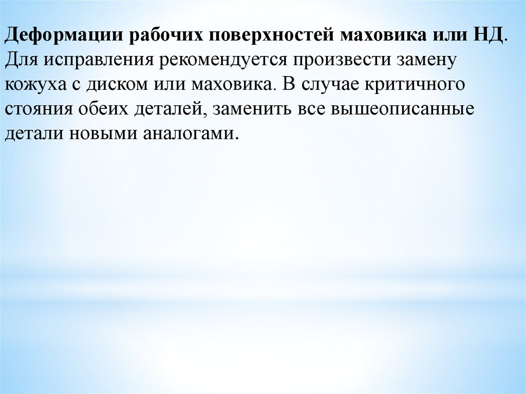 Деформации рабочих поверхностей маховика или НД.Для исправления рекомендуется произвести замену