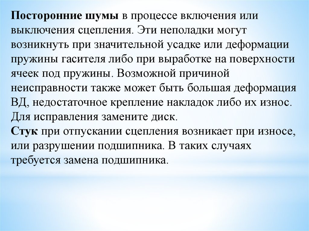 Посторонние шумы в процессе включения иливыключения сцепления. Эти неполадки могут