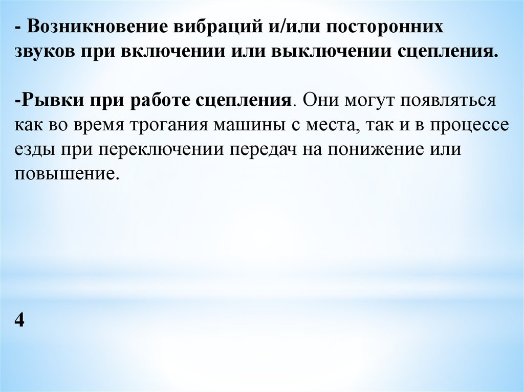 - Возникновение вибраций и/или постороннихзвуков при включении или выключении сцепления.