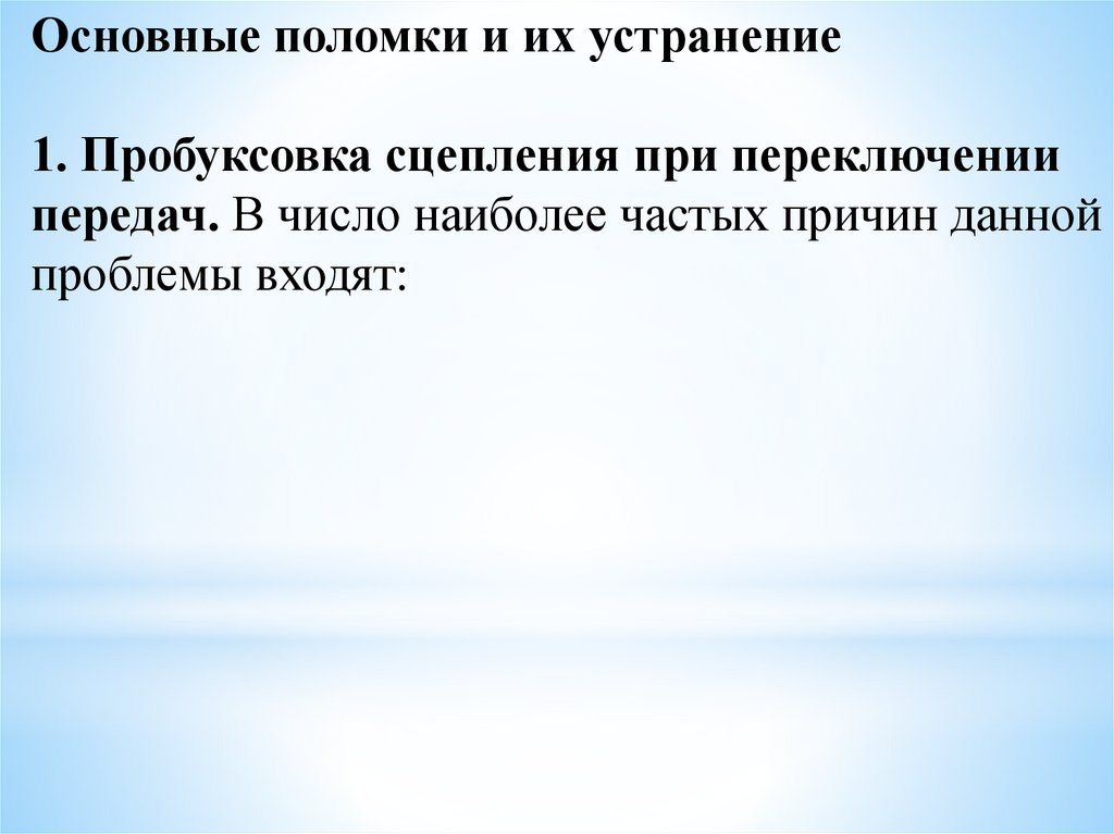 Основные поломки и их устранение1. Пробуксовка сцепления при переключении