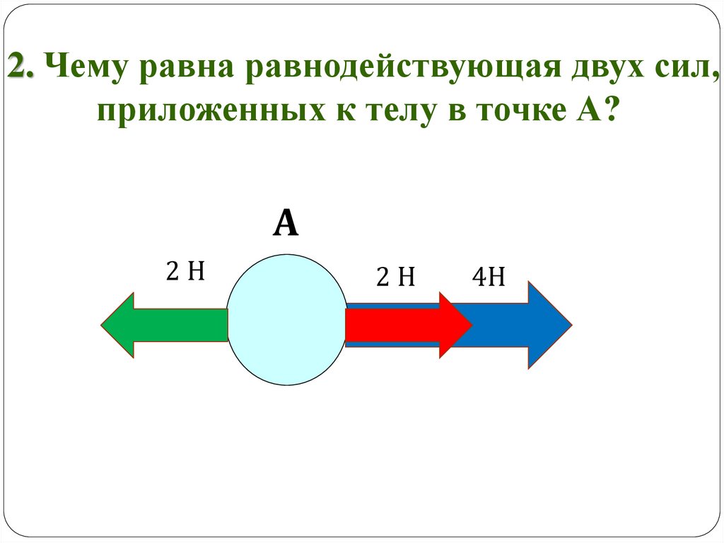 2. Чему равна равнодействующая двух сил,приложенных к телу в точке А?