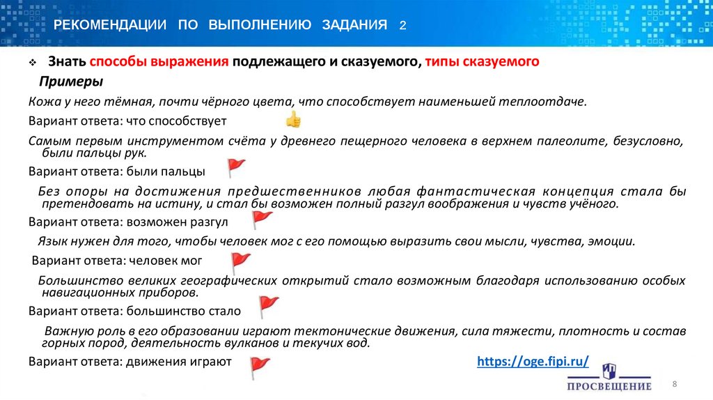 РЕКОМЕНДАЦИИ ПО ВЫПОЛНЕНИЮ ЗАДАНИЯ 2Знать способы выражения подлежащего и сказуемого, типы сказуемого