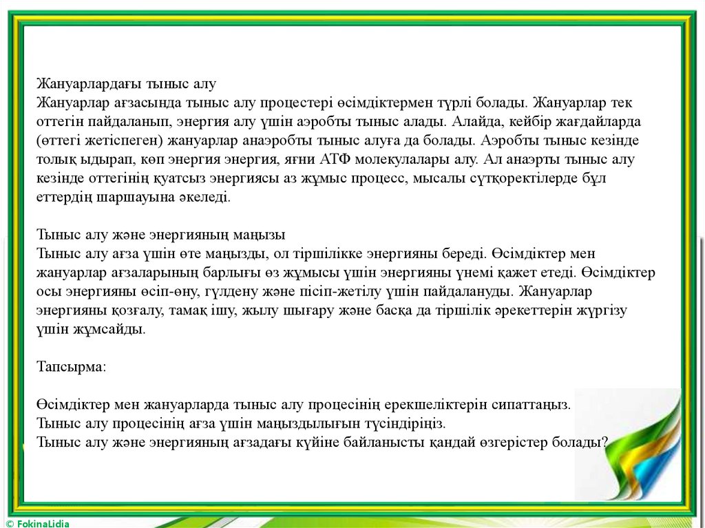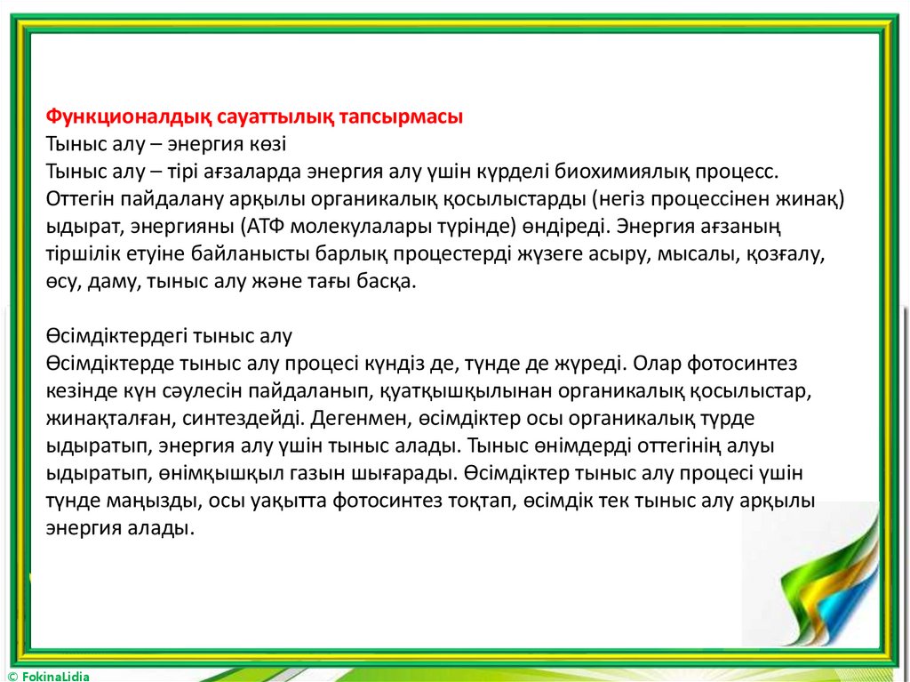 Функционалдық сауаттылық тапсырмасыТыныс алу – энергия көзі