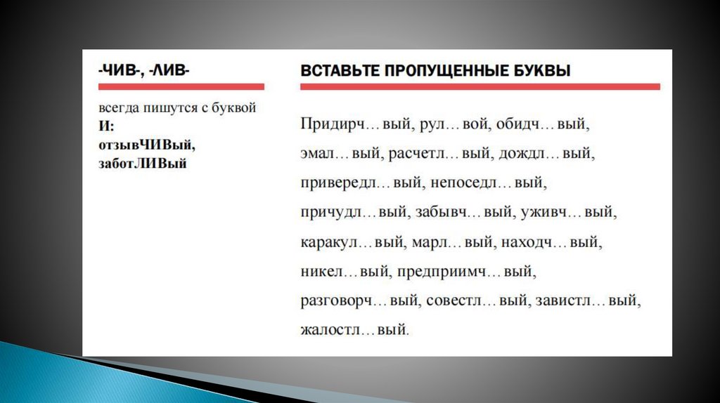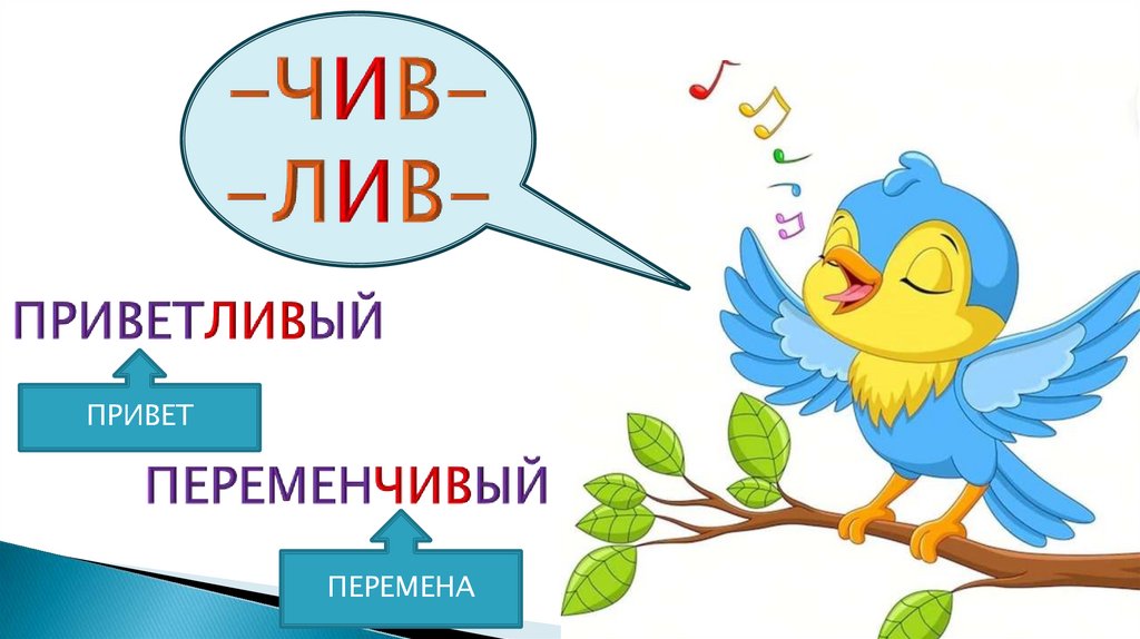 выделяют здесь суффиксы -ЧИВ-, -ЛИВ-. Запомни: в названиях