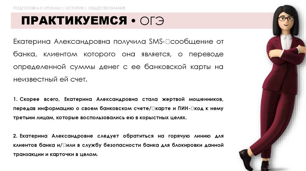 1. Скорее всего, Екатерина Александровна стала жертвой мошенников,