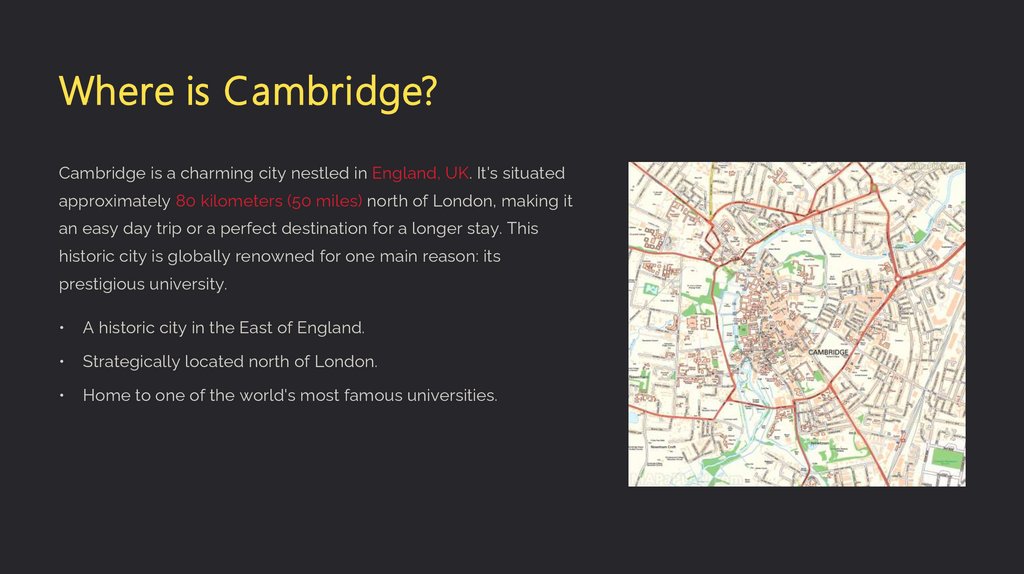 Where is Cambridge?Cambridge is a charming city nestled in England, UK. It's situated