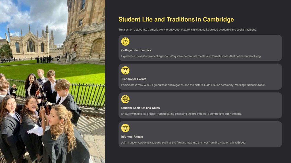 Student Life and Traditions in CambridgeThis section delves into Cambridge's vibrant youth culture, highlighting its unique academic and social traditions.