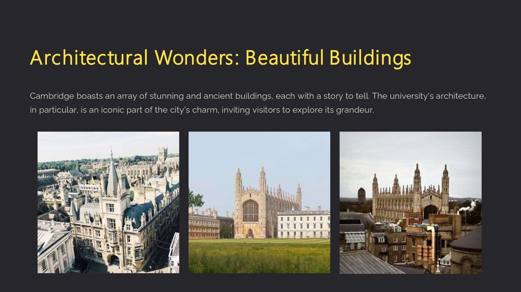 Architectural Wonders: Beautiful BuildingsCambridge boasts an array of stunning and ancient buildings, each with a story to tell. The university's architecture,