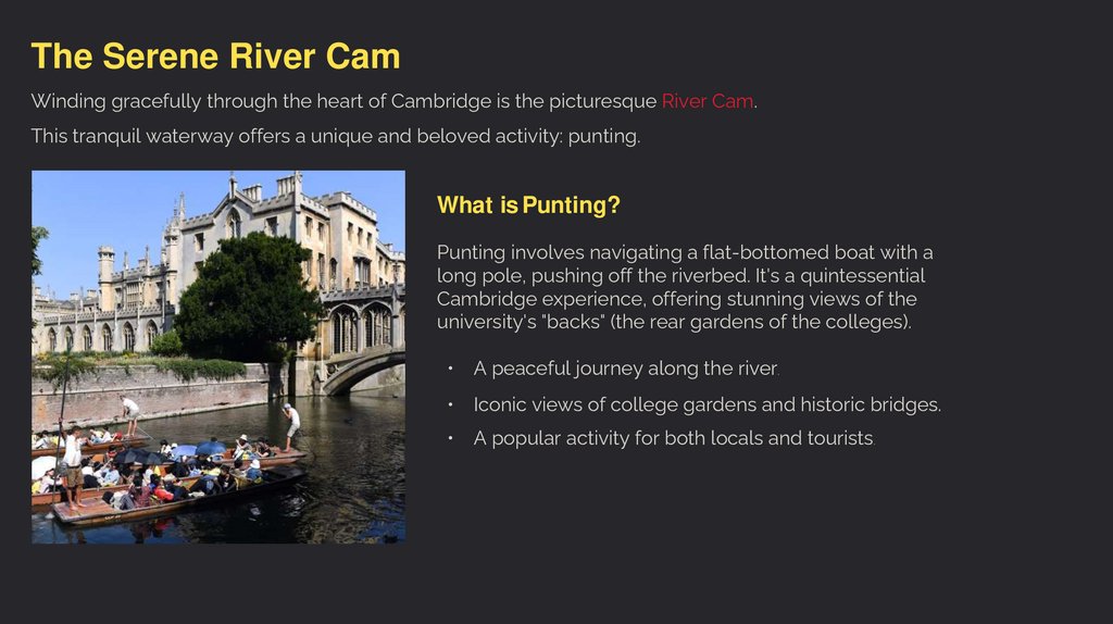 The Serene River CamWinding gracefully through the heart of Cambridge is the picturesque River Cam.