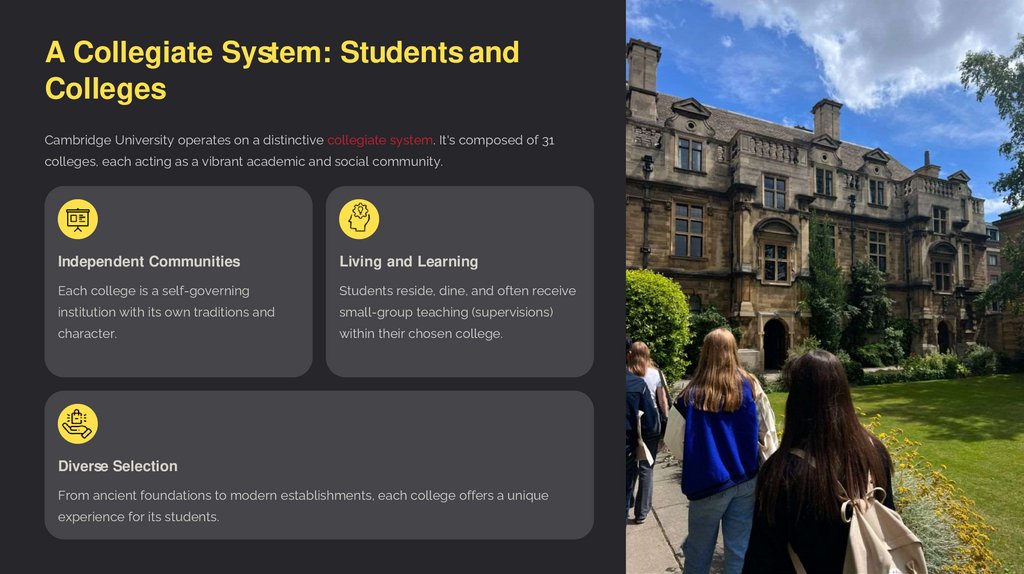 Cambridge University operates on a distinctive collegiate system. It's composed of 31