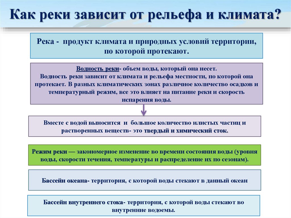 Как реки зависит от рельефа и климата?Река - продукт климата и природных условий территории,