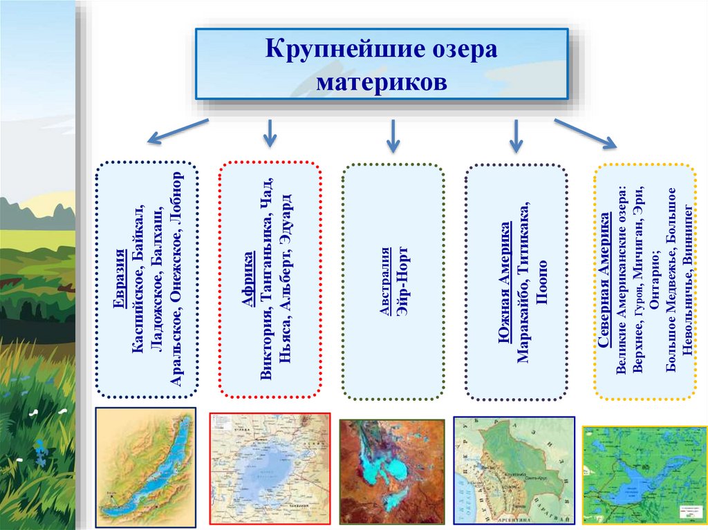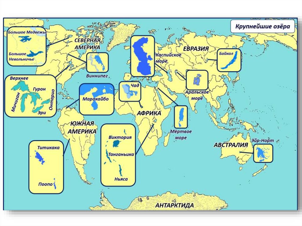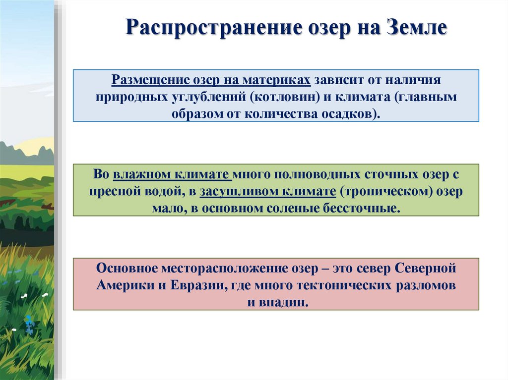 Распространение озер на ЗемлеРазмещение озер на материках зависит от наличия
