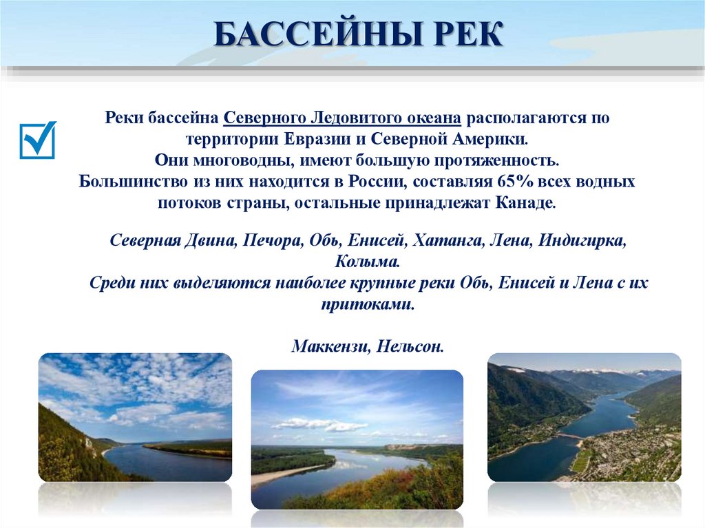 БАССЕЙНЫ РЕКРеки бассейна Северного Ледовитого океана располагаются по