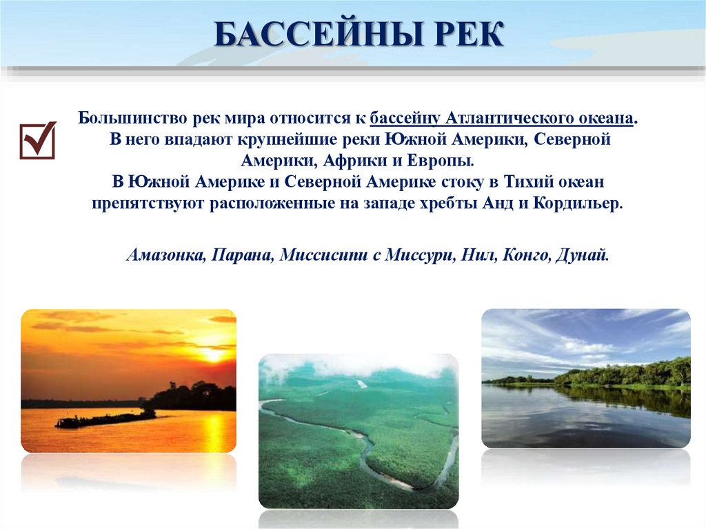 БАССЕЙНЫ РЕКБольшинство рек мира относится к бассейну Атлантического океана.