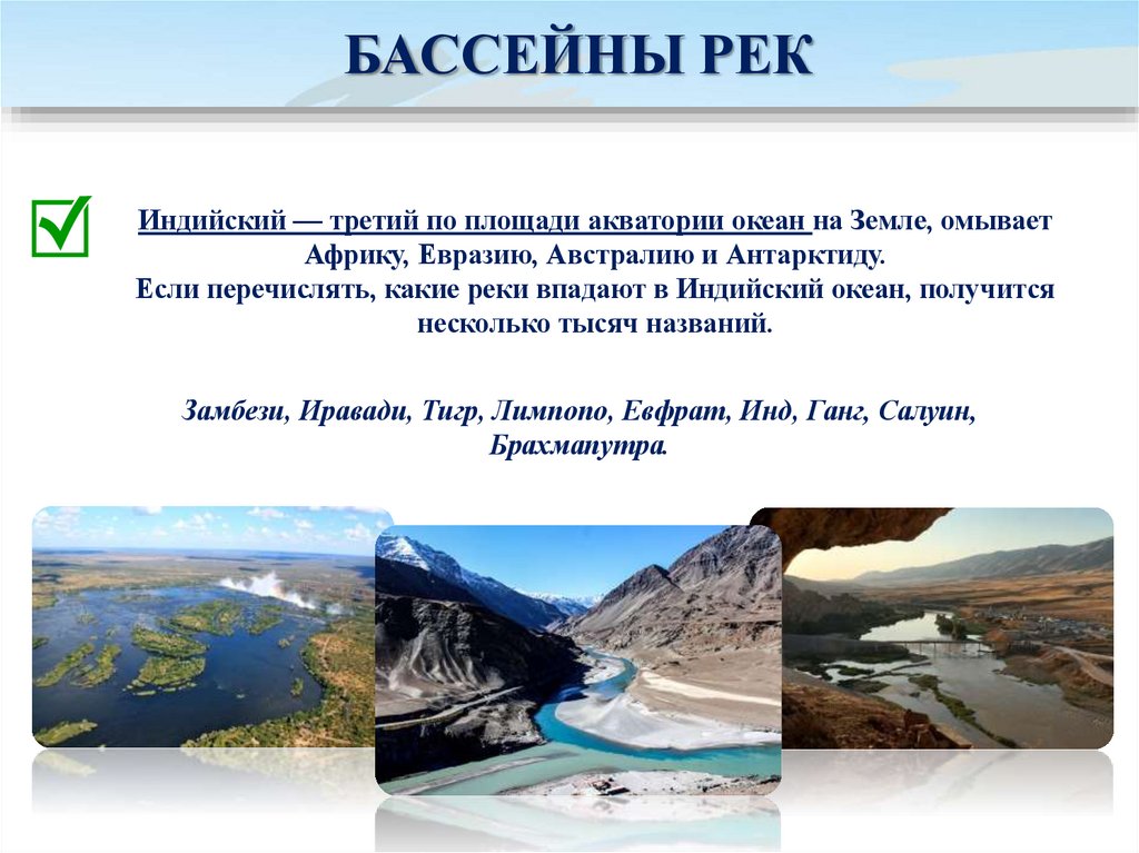 БАССЕЙНЫ РЕКИндийский — третий по площади акватории океан на Земле, омывает