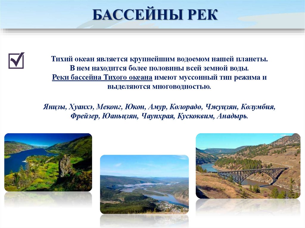 БАССЕЙНЫ РЕКТихий океан является крупнейшим водоемом нашей планеты.
