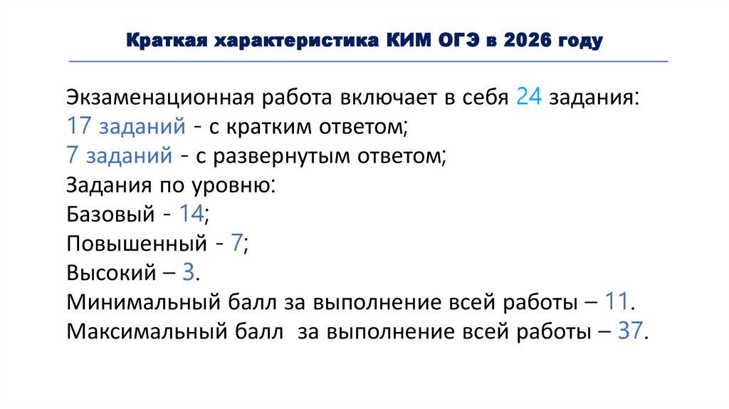 Краткая характеристика КИМ ОГЭ в 2026 годуЭкзаменационная работа включает в себя 24 задания: