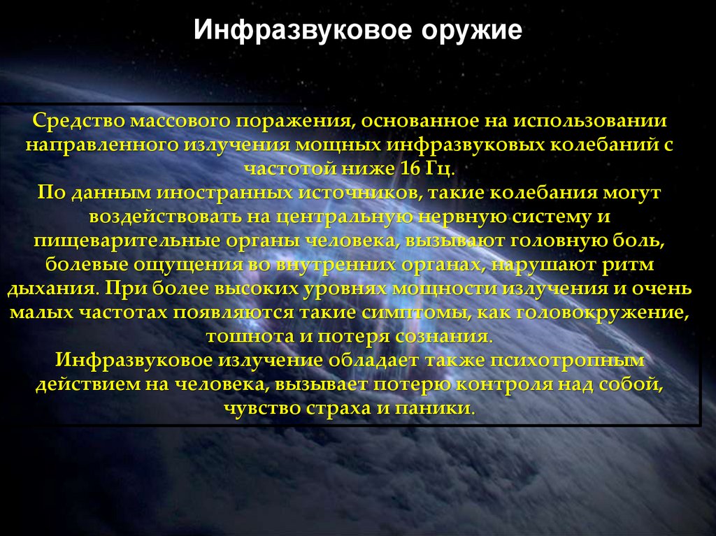 Инфразвуковое оружиеСредство массового поражения, основанное на использовании