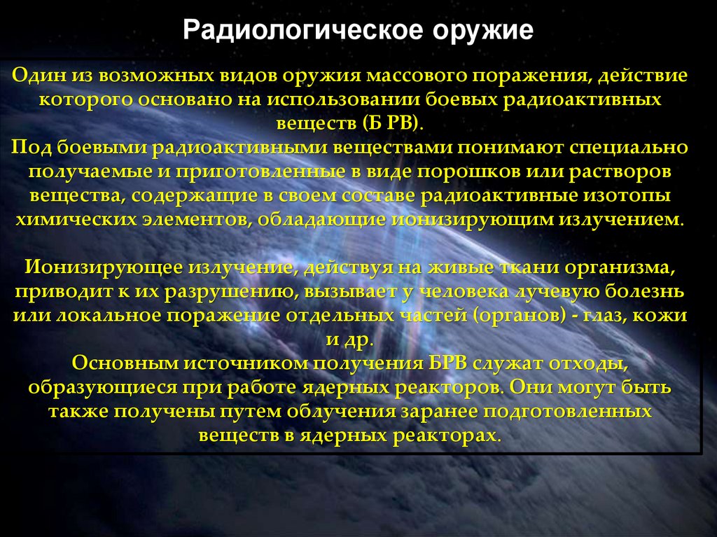 Радиологическое оружиеОдин из возможных видов оружия массового поражения, действие
