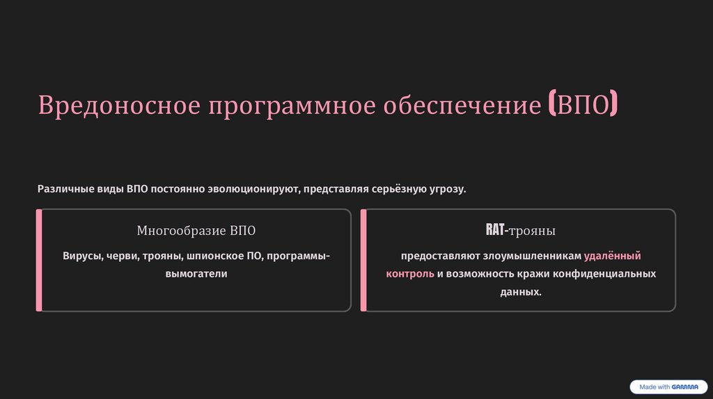 Вредоносное программное обеспечение (ВПО)Различные виды ВПО постоянно эволюционируют, представляя серьёзную угрозу.