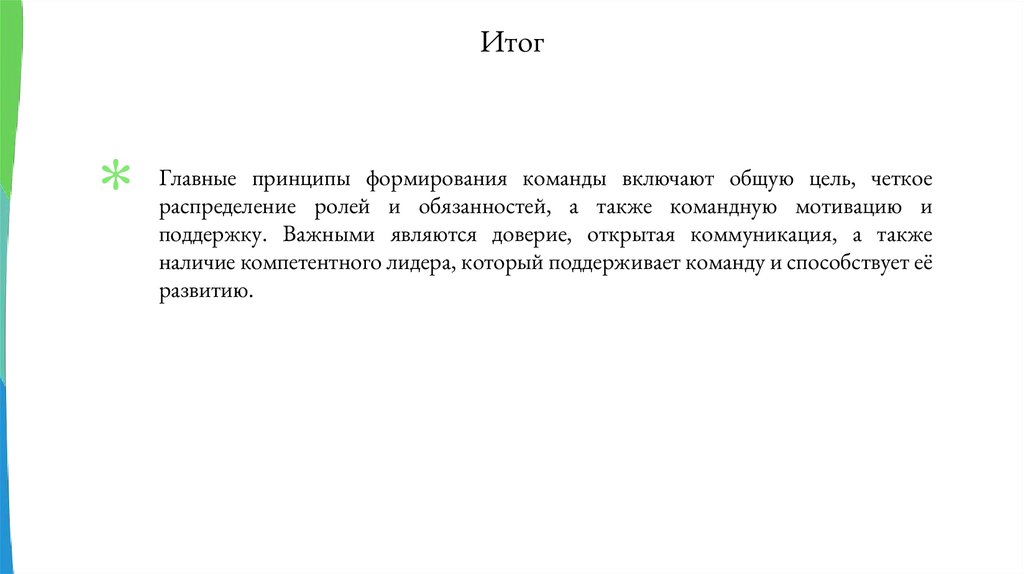 ИтогГлавные принципы формирования команды включают общую цель, четкое