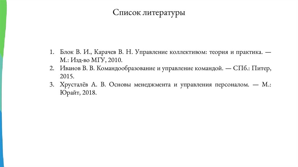 Список литературы1. Блок В. И., Карачев В. Н. Управление коллективом: теория и практика. —