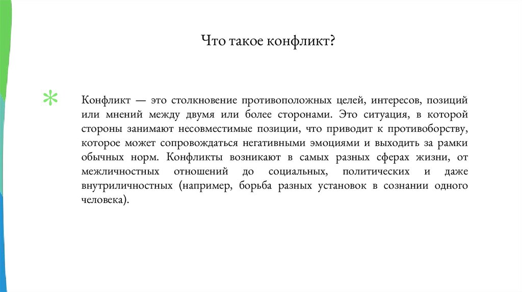 Что такое конфликт?Конфликт — это столкновение противоположных целей, интересов, позиций