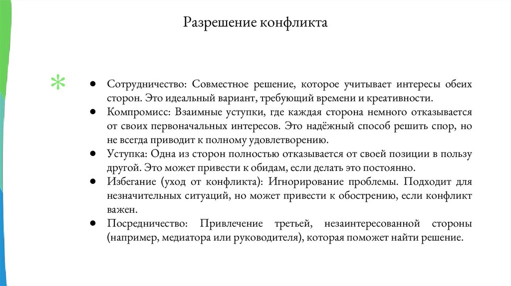 Разрешение конфликта● Сотрудничество: Совместное решение, которое учитывает интересы обеих