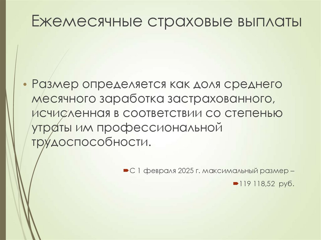Ежемесячные страховые выплаты• Размер определяется как доля среднего