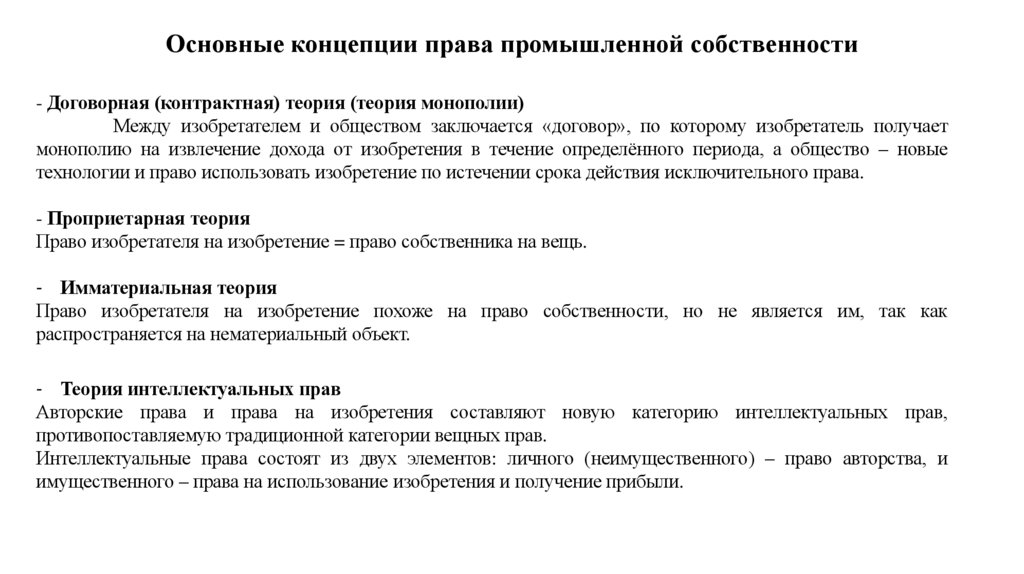 Основные концепции права промышленной собственности- Договорная (контрактная) теория (теория монополии)