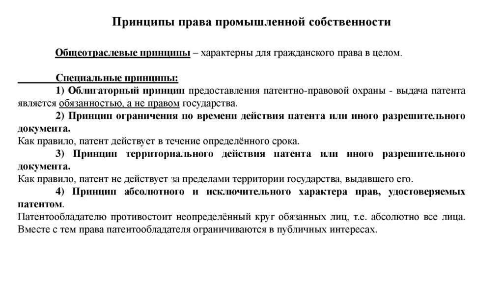 Принципы права промышленной собственностиОбщеотраслевые принципы – характерны для гражданского права в целом.