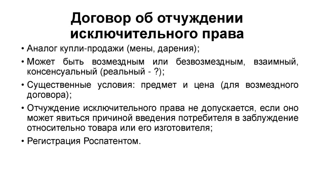 • Возможны договоры об отчуждении исключительного права и
