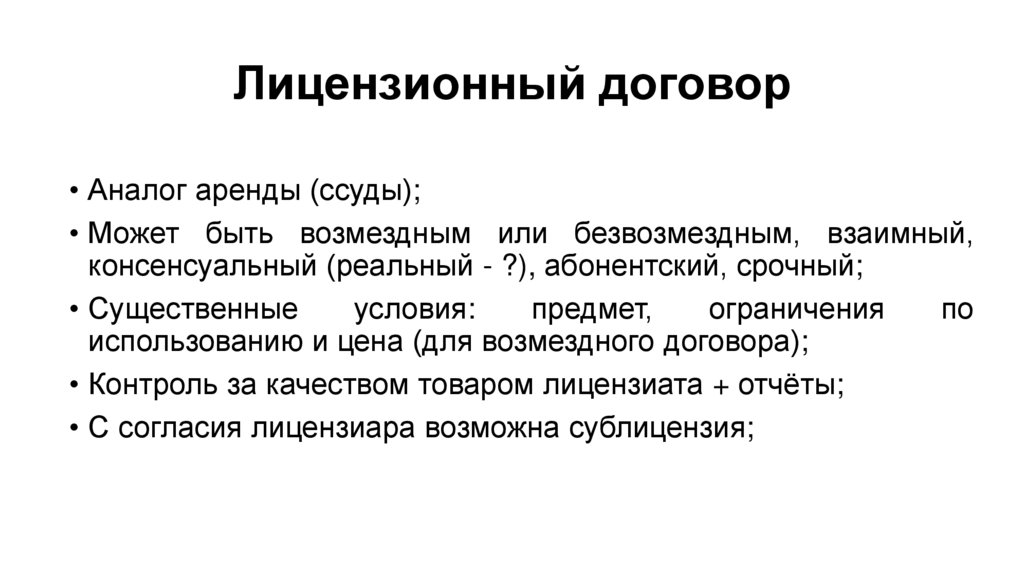 Лицензионный договор• Аналог аренды (ссуды);