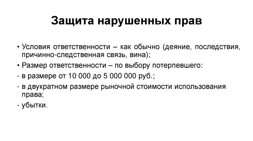 Защита нарушенных прав• Условия ответственности – как обычно (деяние, последствия,