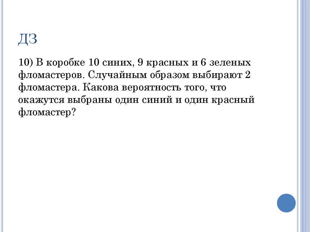 ДЗ10) В коробке 10 синих, 9 красных и 6 зеленых