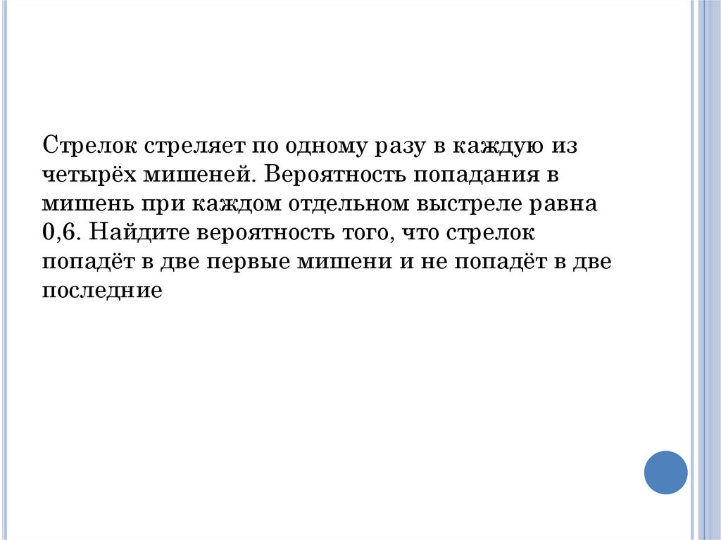 Стрелок стреляет по одному разу в каждую изчетырёх мишеней. Вероятность попадания в