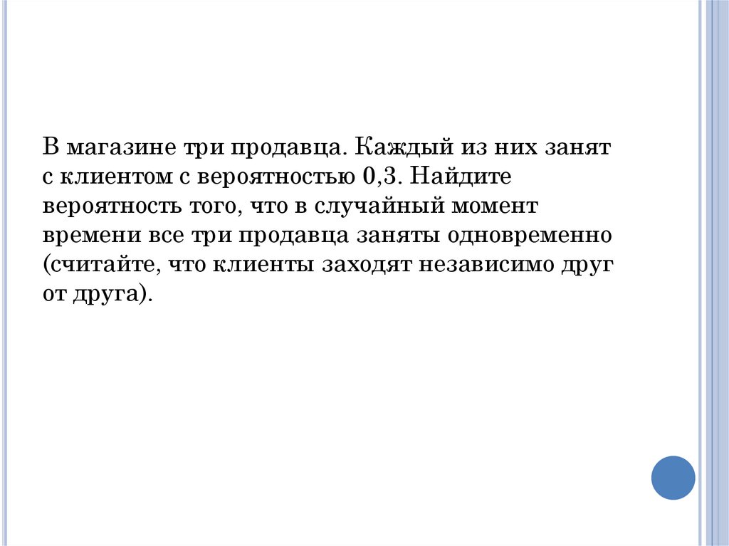 В магазине три продавца. Каждый из них занятс клиентом с вероятностью 0,3. Найдите