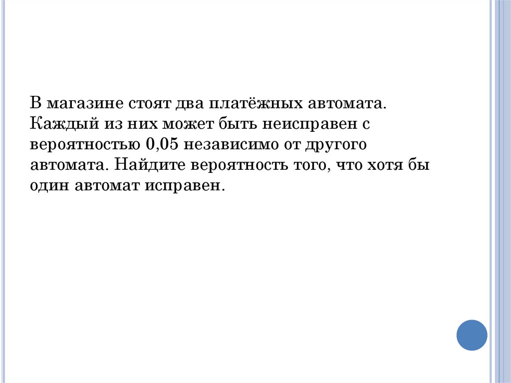 В магазине стоят два платёжных автомата.Каждый из них может быть неисправен с