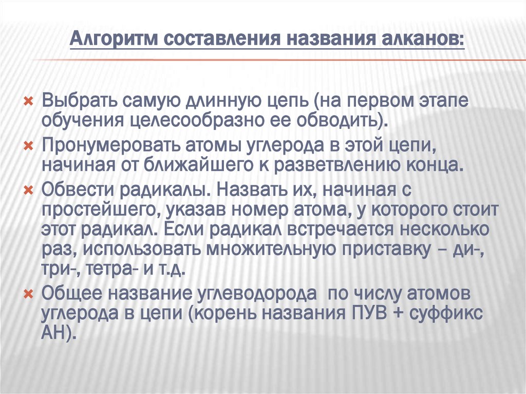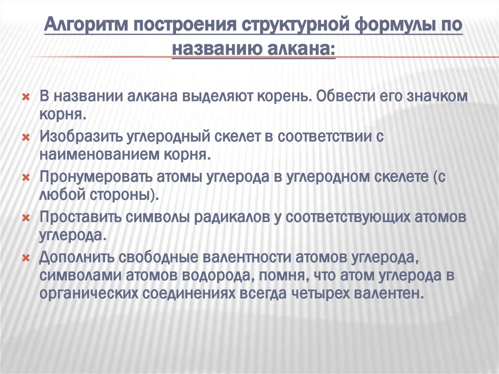 Алгоритм построения структурной формулы поназванию алкана: