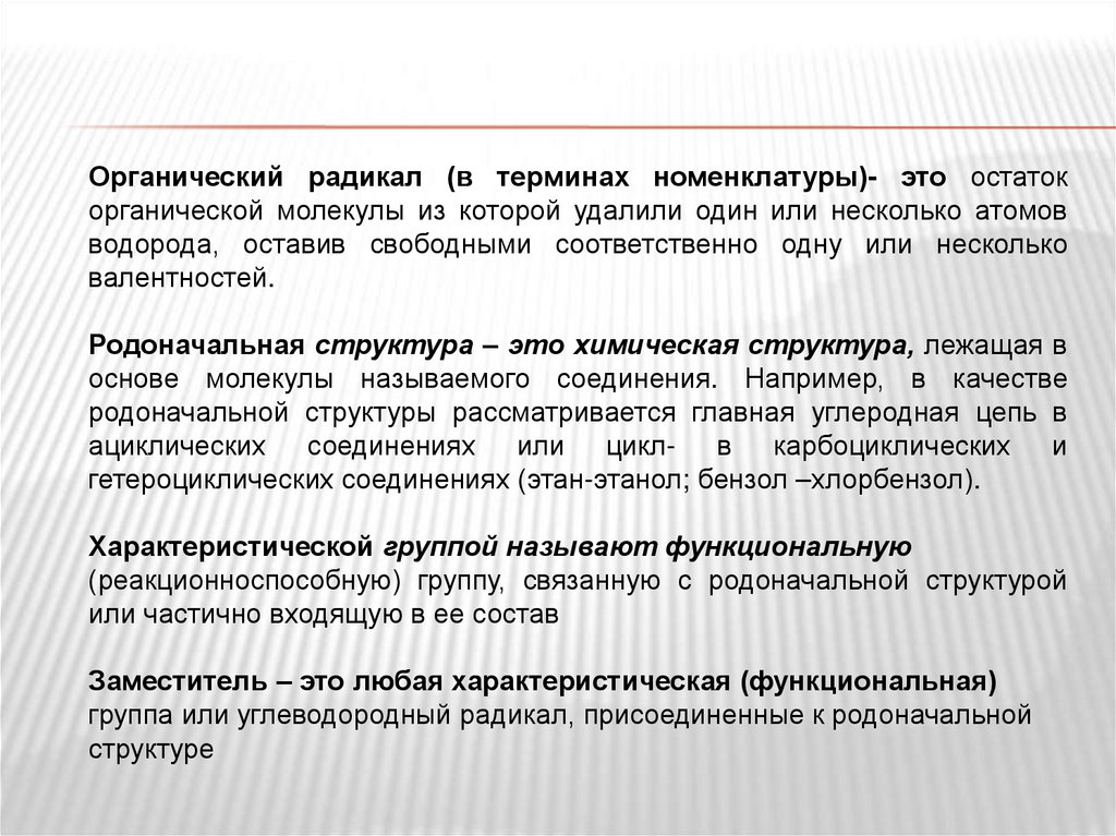 Органический радикал (в терминах номенклатуры)- это остатокорганической молекулы из которой удалили один или несколько атомов