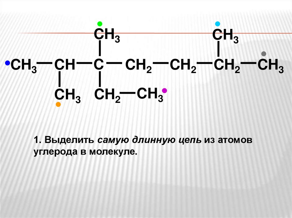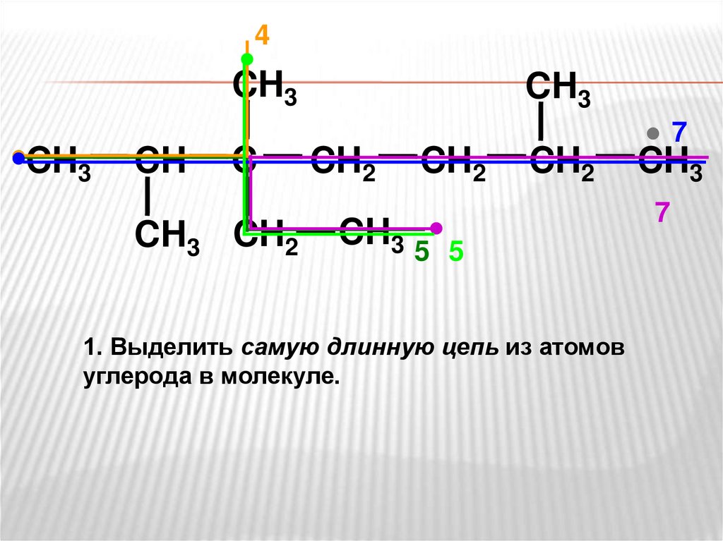 1. Выделить самую длинную цепь из атомов