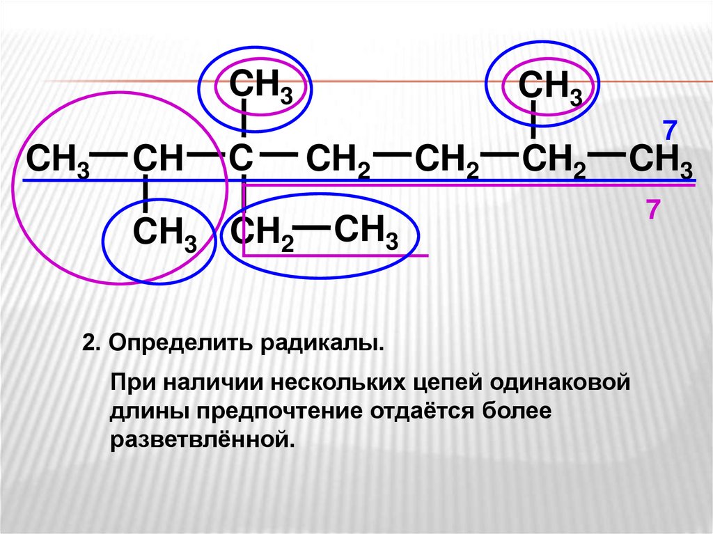 Алгоритм составления названия алканов:Выбрать самую длинную цепь (на первом этапе